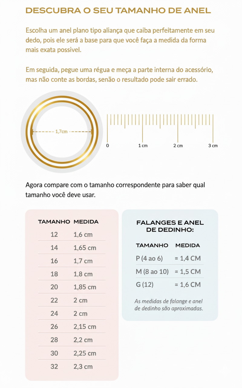 - Considere o formato do anel; modelos mais largos podem exigir um tamanho maior.