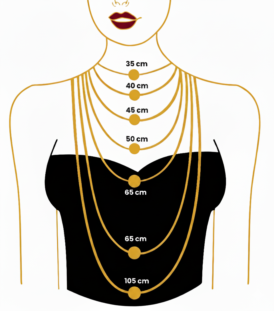 - Para colares com pingentes, leve em conta o comprimento total, incluindo o pingente.